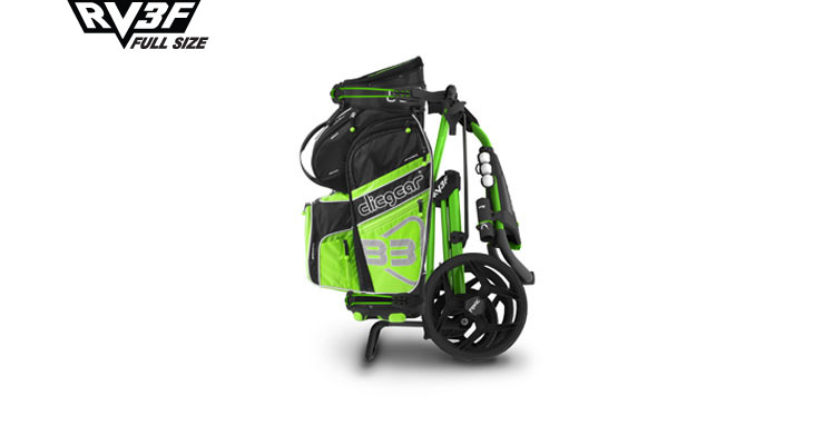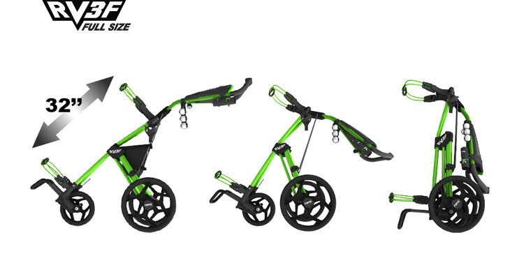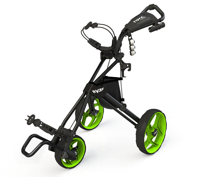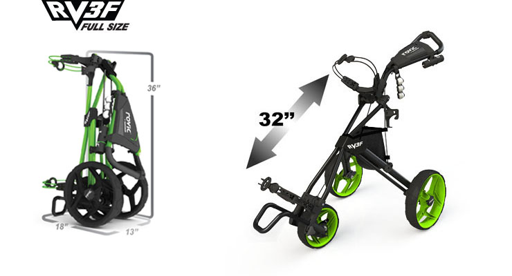 The Rovic® RV3F is a Full sized three wheel cart which is designed to be easy to use and still full of features. The RV3F can accommodate almost any bag size and keep it in place when the cart is folded. This makes the RV3F perfect for storage at the golf club. The RV3F shares the Clicgear Accessory Tab system allowing the use of the many Clicgear standard accessories with this cart. The RV3F uses an easy one step folding system. The front wheel is fully adjustable to allow for perfect tracking throughout the life of the cart. Large 13” rear wheels make this cart very easy to push as well. All RV3F carts come with a ball clip, cup holder, standard umbrella mount and storage net.